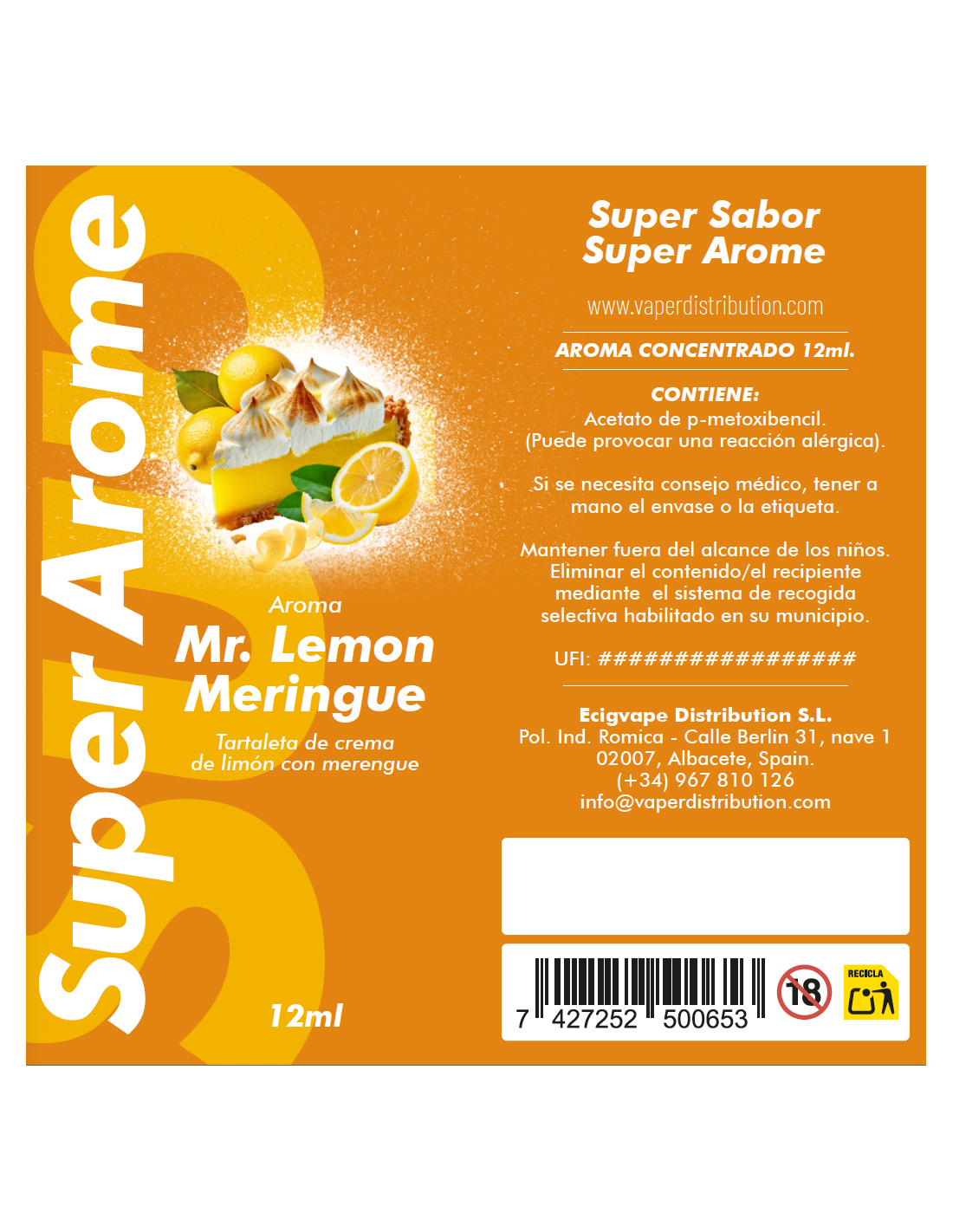 El aroma Mr. Lemon Meringue en formato Longfill de 12 ml de Super Arome. ¡Ofrece un sabor muy cremoso de una deliciosa tartaleta de crema de limón con merengue que deleitará a tu paladar!